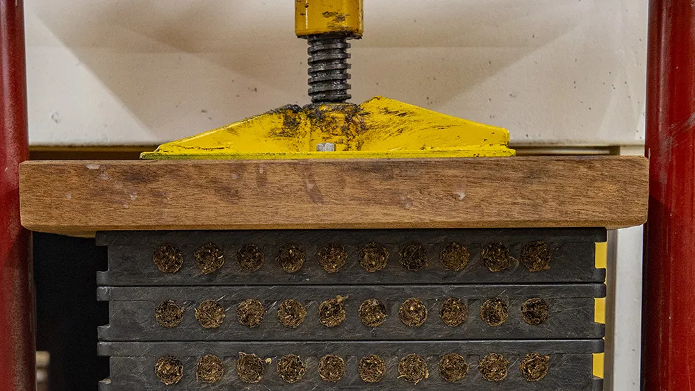 Mỗi điếu xì gà được làm bởi một nhóm gồm hai người. Một công nhân lấy những chiếc lá và bó chúng lại thành hỗn hợp – công thức bí mật – tạo nên cốt lõi của điếu xì gà. Sau đó, anh ấy nhét các bó hoa vào khuôn 10 chiếc như minh họa ở đây, sau đó xếp chồng lên nhau và ép lại.