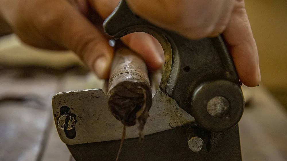 Sau khi ép, thành viên đội thứ hai lấy xì gà ra khỏi khuôn và gói lá giấy gói lại. Dụng cụ bằng gỗ được đánh dấu 54 là một loại cepo, được sử dụng để đo đường kính hoặc thước đo vòng của mỗi điếu xì gà, để đảm bảo độ dày của nó là chính xác. Ở giữa là dụng cụ cắt, hay còn gọi là máy chém.