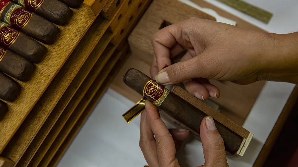 Bước cuối cùng là dán dải đặc trưng của nó, được đo chính xác sao cho khi ở trong hộp, tất cả các dải xì gà đều được căn chỉnh hoàn hảo.